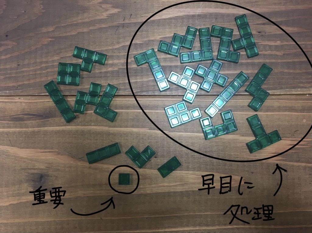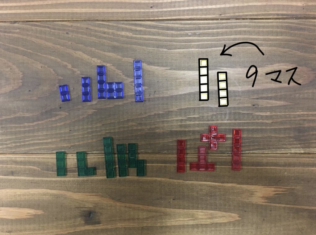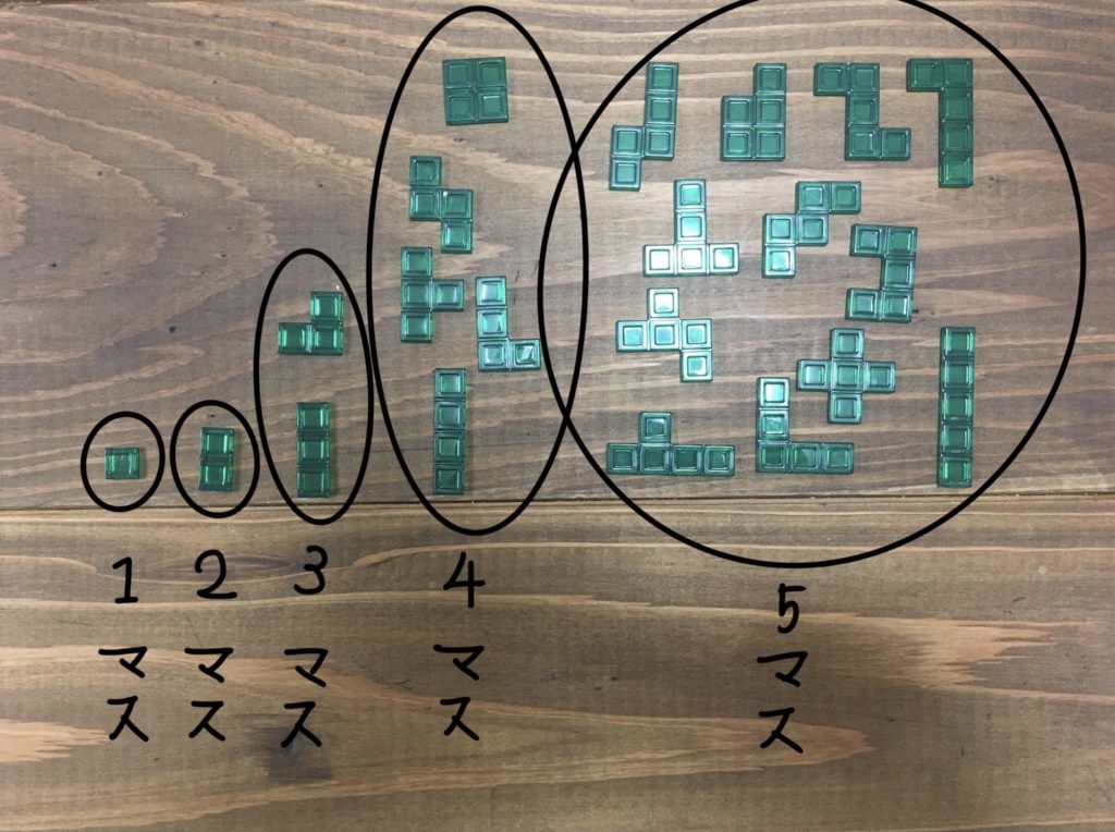 ①ゲーム終盤になると、マス目の多いピースは置きにくくなるので、マス目が5つのピースから優先的に