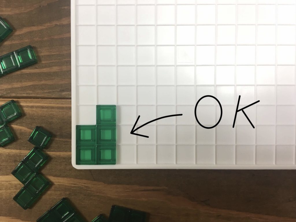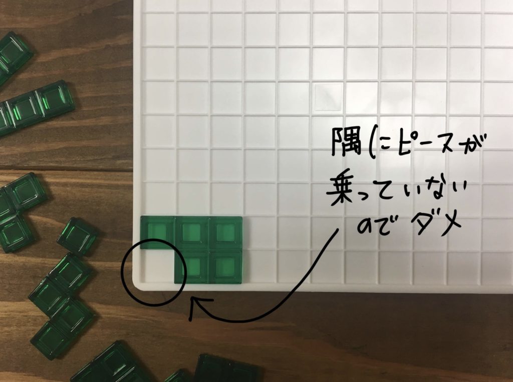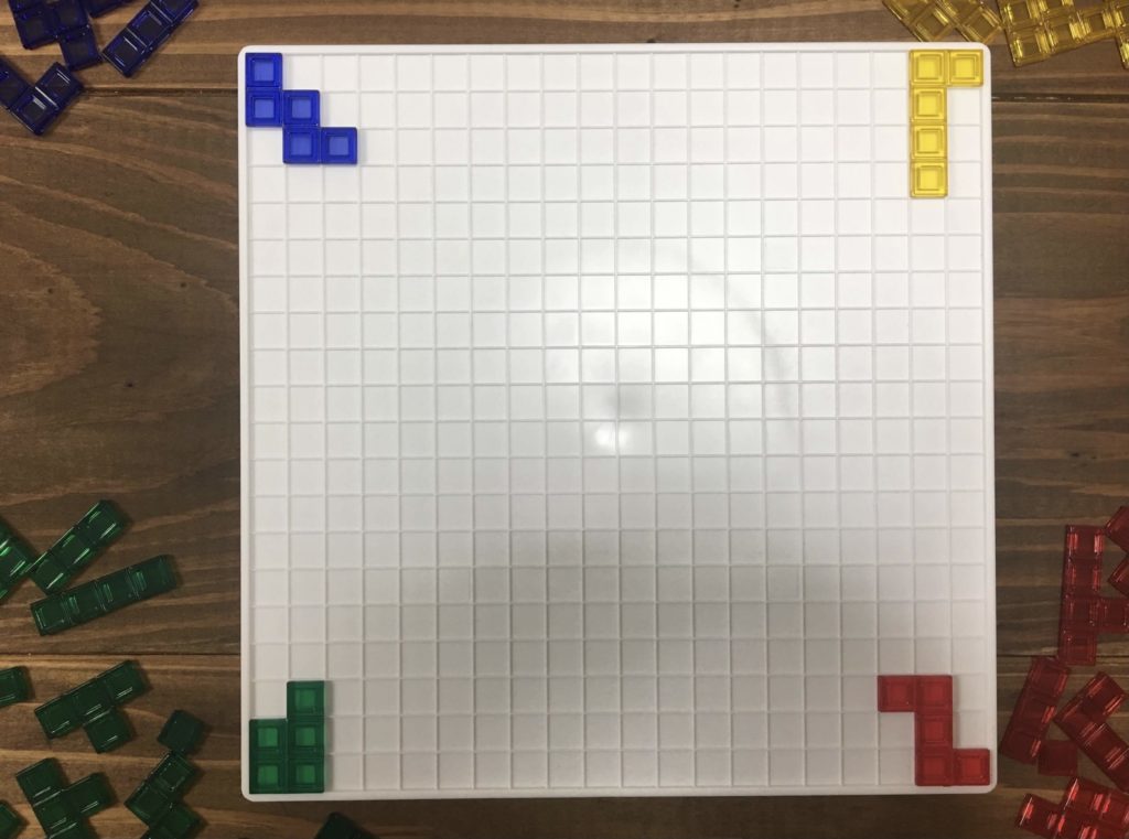 初めに自分の順番が来たら、ボードの隅のマス目を埋める様にしてピースを1つ置きます。