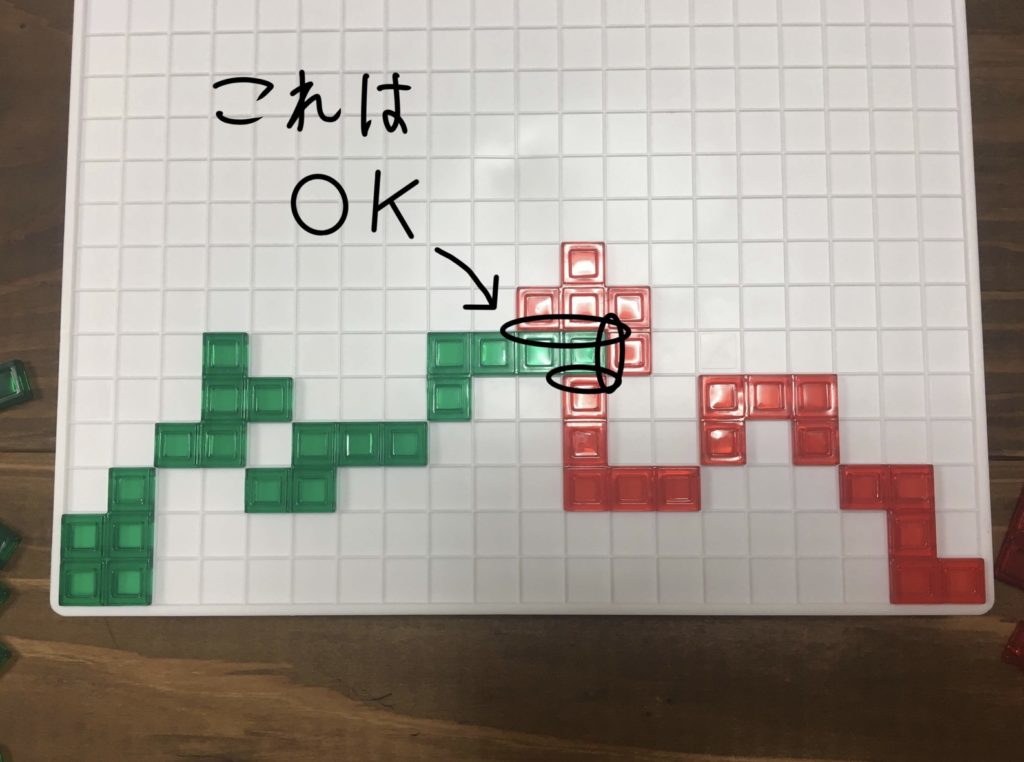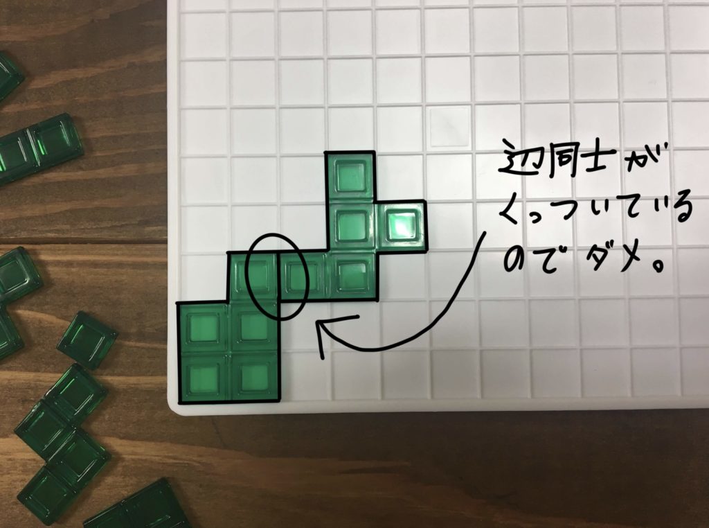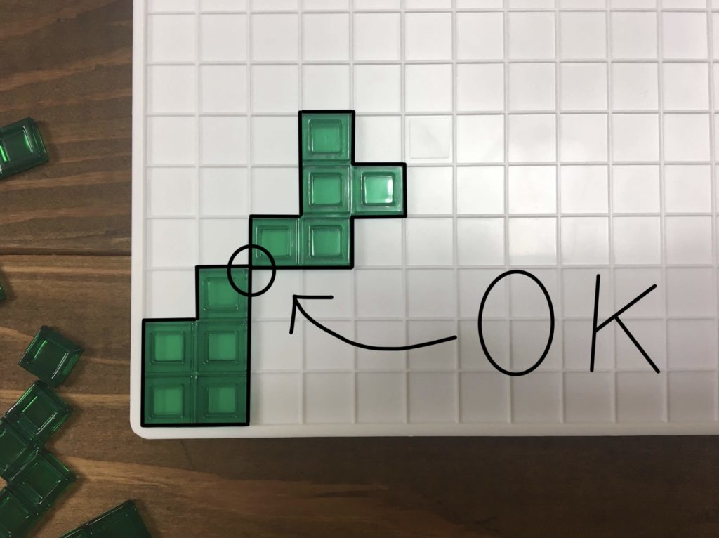 再び順番が回って来たら、2つ目のピースを置きますが、このとき既に置かれているピースと角同士がつながる様に置く必要があります。